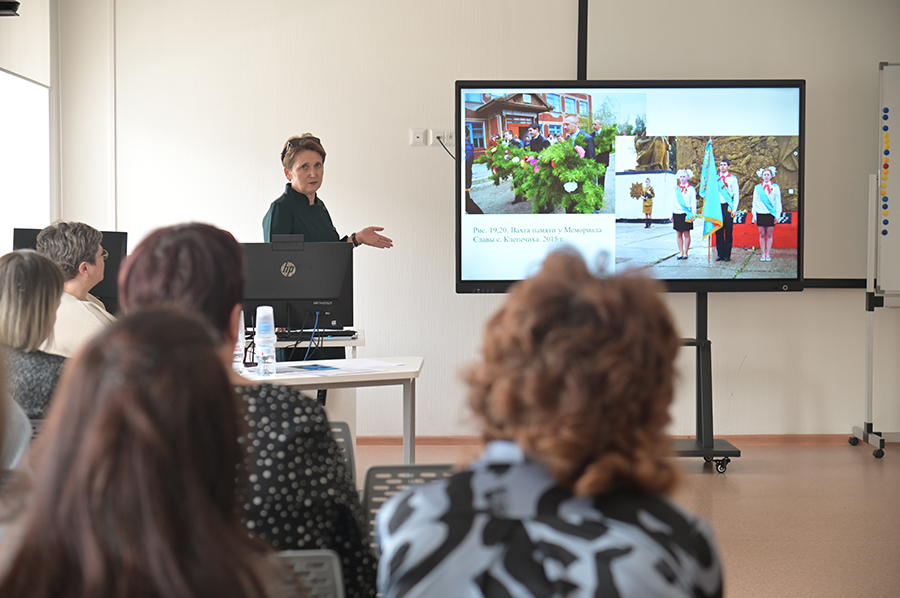 Ответственная за учебно-воспитательную работу Клепечихинской школы — филиала Поспелихинской школы № 1 Любовь Мухопад поделилась, как работа над краеведческими проектами помогает сельским школьникам почувствовать связь времен и влияет на их духовно-нравственное становление. Педагог привела конкретные примеры. Ученики исследовали историю мобилизации женщин родного села, а потом создали проект «Шли девчата по войне». Другая школьница изучила в районном архиве документы Ленинградского дома малютки, эвакуированного в Клепечиху. А благодаря энтузиазму учителей и учеников в 2007 году в селе установили жернова – памятник жертвам политических репрессий. Педагог уверена, что ее ученики не будут жарить хлеб на Вечном огне и не устроят там посиделок.
