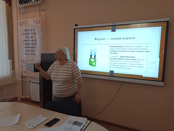 Педагоги школы № 53 представили коллективные способы, эффективные приемы обучения и технологические карты, позволяющие педагогу соотнести требования к уроку, действия учителя и учебника, базовые универсальные учебные действия, способы организации самооценки достигнутых результатов. Советник по воспитанию, учителя начальных классов, английского, истории, физической культуры показали применение методики обучения, направленной на формирование предметных, метапредметных и личностных результатов на уроках и внеурочных занятиях. Отмечалось также, что технологическая карта урока является неотъемлемой частью деятельности любого педагога. Помимо этого, был представлен алгоритм самоанализа и анализа урока, который активно применяется в образовательной организации.