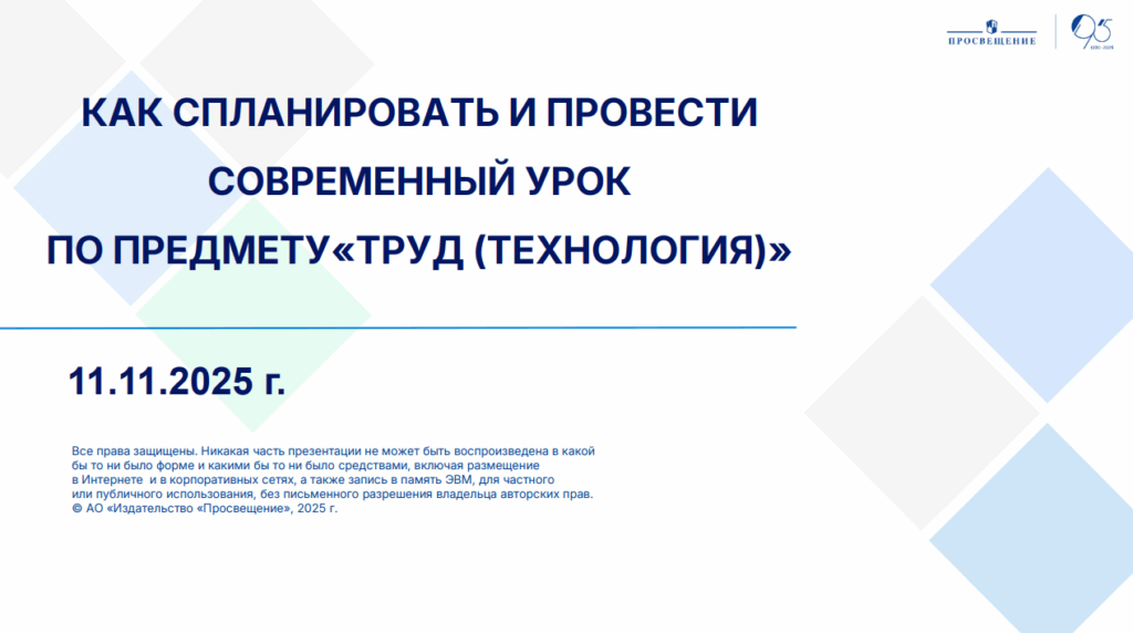 В рамках плана работы отделения по труду (технологии) краевого учебно-методического объединения в части использования оборудования, поступающего в школы по государственным программам, 11 ноября 2025 года для учителей труда (технологии) был проведен вебинар «Как спланировать и провести современный урок». На вебинаре выступила Панкратьева Мария Евгеньевна, руководитель направления Центра информатики, технологии и профильного обучения ГК «Просвещение». Перед вебинаром спикеру были переданы вопросы от учителей края, касающиеся использования нового оборудования на уроках труда (технологии). Ответы на данные вопросы нашли отражение в ходе онлайн-встречи. Презентация выступления: https://cloud.iro22.ru/s/DD3iR3DKEfX3FCA