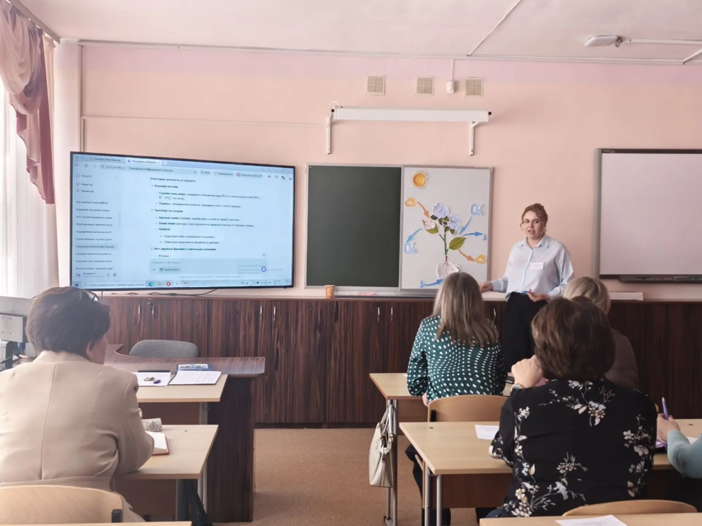 Педагоги школы поделись со стажерами опытом интеграции искусственного интеллекта в образовательный процесс на уроках разных предметов: биологии, географии, иностранного языка, истории, литературы, математики, окружающего мира, русского языка, физики, химии. Также они раскрыли возможности и преимущества применения нейросетей в образовании.