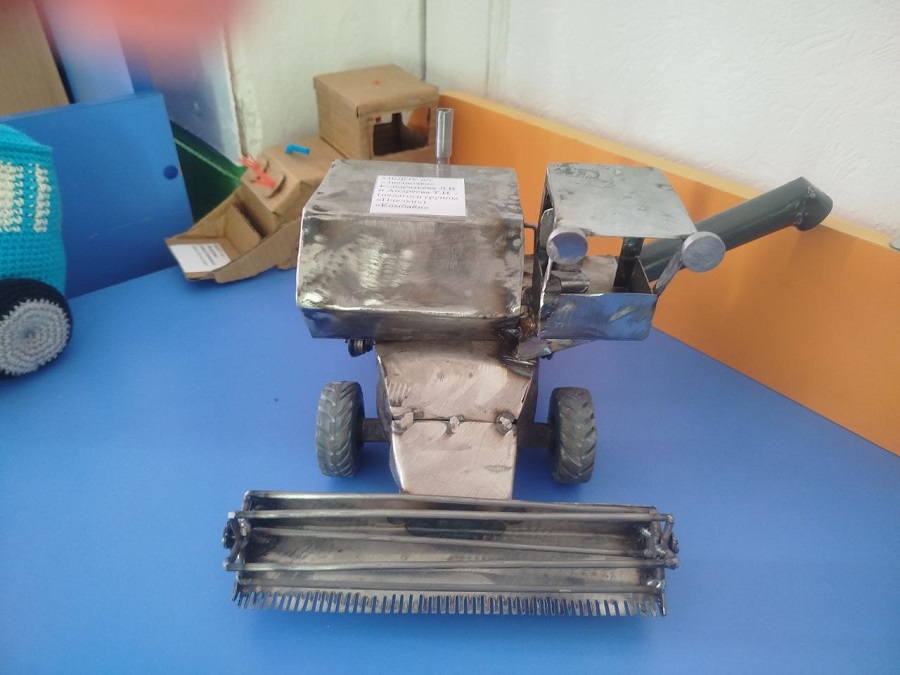 — Вместе с детьми они сделали макеты сельхозтехники из картона, дерева и пластмассы. Один родитель сварил металлический мини-комбайн, у которого вращается жатка и открываются двери. Эти работы выставлялись в детском саду и в школе.