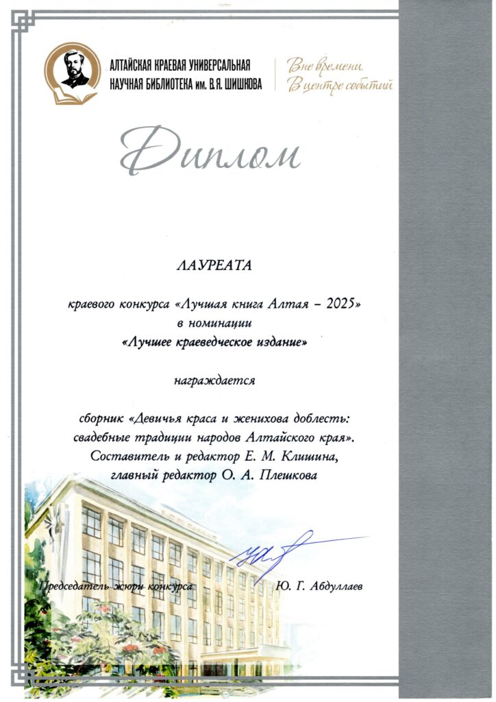 Среди лауреатов конкурса – издание «Девичья краса и женихова доблесть: свадебные традиции народов Алтайского края», подготовленное Алтайским институтом развития образования им. А. М. Топорова при поддержке Министерства образования и науки Алтайского края.