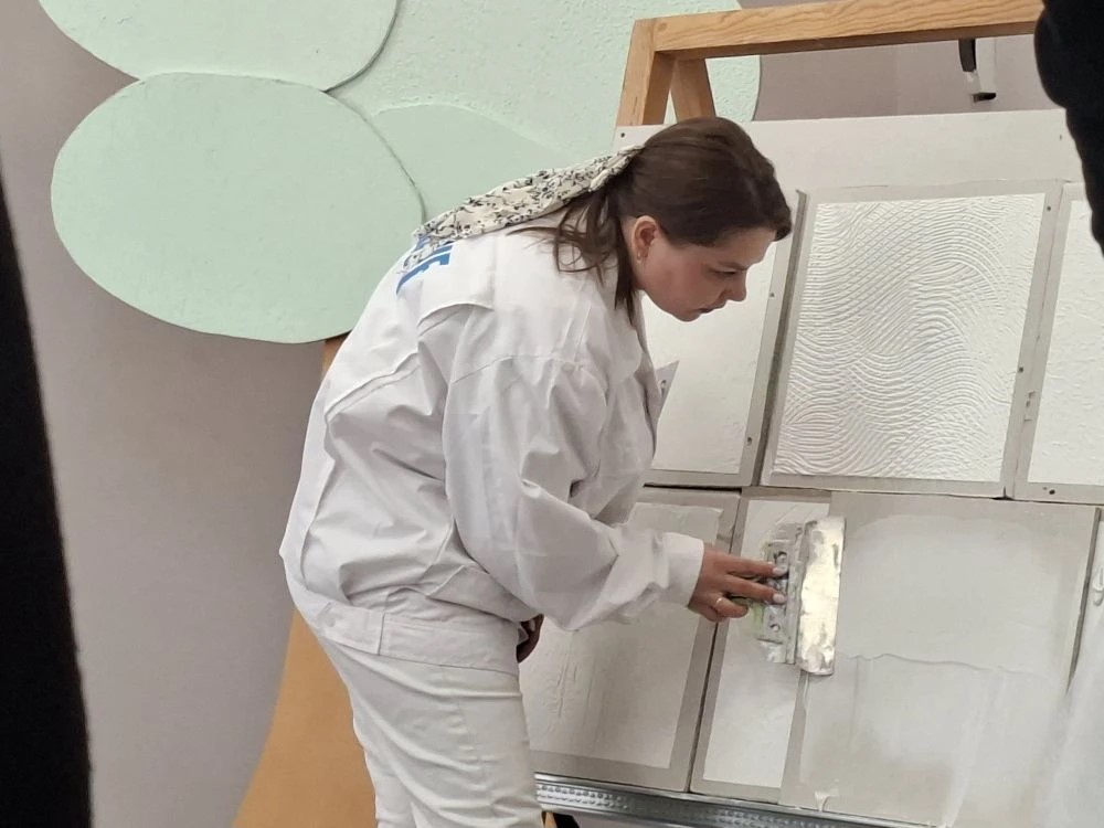 На занятии Ксении Поселовой, мастера производственного обучения по профессии «Мастер отделочных строительных и декоративных работ» Алтайского архитектурно-строительного колледжа, обучающиеся учились работать с декоративной штукатуркой на гипсовой основе. С использование разных техник создания фактур студенты выполнили декоративные покрытия на образцах.