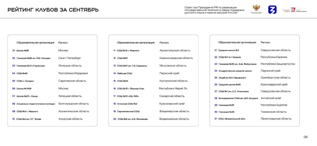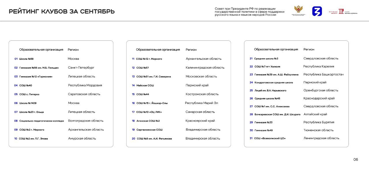 Генеральный директор Российского общества «Знание» Максим Древаль подвел первые итоги и объявил регионы-лидеры, чьи клубы стали самыми активными в сентябре. Совсем скоро в эти школы приедут с творческими встречами известные артисты, звезды театра и кино. В числе лидеров из Алтайского края – Бочкаревская школа им. Д. И. Шкурата. Изучить рейтинг можно во вложении. А зарегистрировать свой литературный клуб вместе со «Знанием» можно по ссылке.