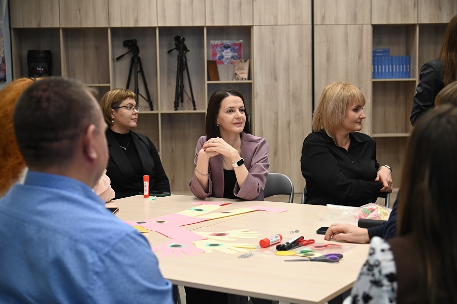 Когда официальная часть завершилась, педагоги разделились на две группы, в них мастер-класс по командообразованию провели Наталья Платонова и Ирина Агафонова. Команды создавали символическую «идеальную модель мастера года» из цветной бумаги: у кого-то он получился с большими руками — много делает, у кого-то с большими ногами — уверенно шагает вперёд.