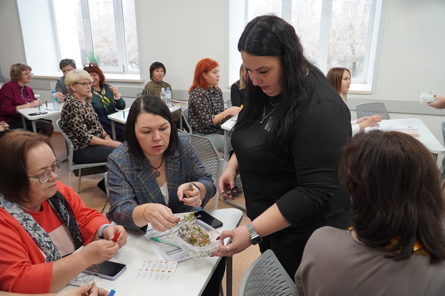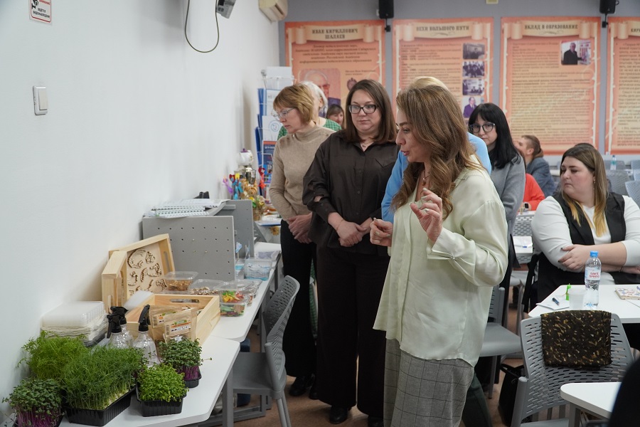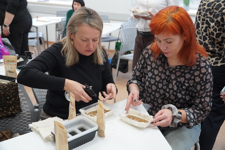 Заведующий детским садом № 93 г. Бийска Екатерина Оленина и воспитатель Анастасия Шляпина рассказали о проекте «Экостанция. Жизнь в стиле ЭКО». Он реализуется в детском саду и направлен на приобщение дошкольников к здоровому образу жизни и культуре правильного питания, создание развивающего пространства и мотивирующей среды. Все желающие участники мероприятия самостоятельно посеяли семена микрозелени, а некоторые получили наборы семян для выращивания в подарок.