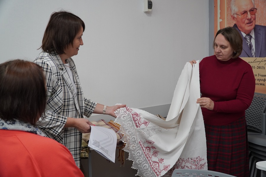 Отреставрированные образцы художественного текстиля, найденные в краевых экспедициях, показала Елена Чебыкина, педагог дополнительного образования Алтайского краевого центра детского отдыха, туризма и краеведения «Алтай». Одно из направлений работы центра — изучение и возрождение прядения и узорного ткачества.