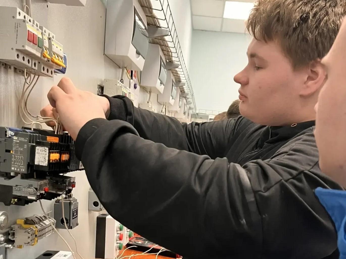 Под руководством Татьяны Замятиной, опытного наставника и мастера производственного обучения, а также наставников из числа обучающихся второго курса, первокурсники отработали навыки, необходимые для сдачи демонстрационного экзамена по компетенции «Электромонтаж». Он включает монтаж этажного распределительного щита и осветительной сети, а также выявление неисправностей испытания электроустановок.