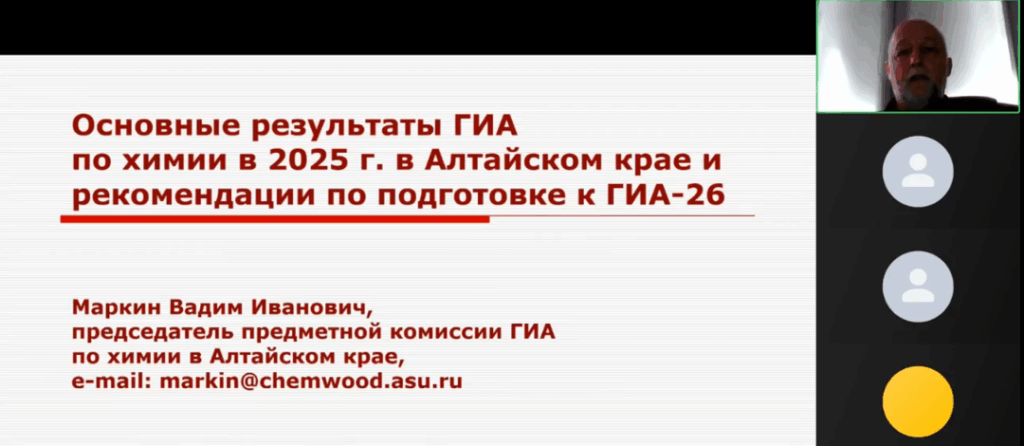 06.11.2025 состоялась первая из запланированных встреч с председателями краевых предметных комиссий государственной итоговой аттестации. На вебинаре выступил Маркин Вадим Иванович, доцент кафедры органической химии ФГБОУ ВО «Алтайский государственный университет», кандидат химических наук, доцент, председатель предметной комиссии ГИА по химии в Алтайском крае. Видеозапись доступна по ссылке. Дальнейшие встречи состоятся по графику: