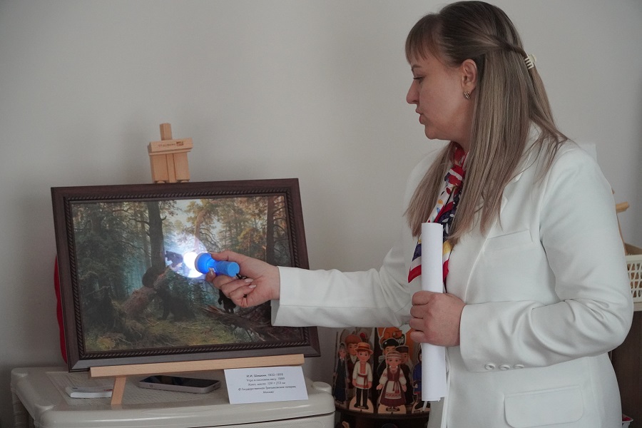 После экскурсии гости выполнили творческое задание «Ожившая картина»: используя репродукцию «Утро в сосновом лесу» Ивана Шишкина, они создавали объемную композицию из природных материалов и подручных средств: пластилина, шишек, веток, мха и прочего.