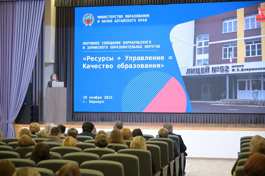 19 ноября в Барнауле в новом корпусе лицея № 52 имени Ф. Э. Дзержинского состоялось заключительное окружное совещание «Ресурсы + Управление = Качество образования». В его работе приняли участие управленческие команды 13 муниципальных образований Барнаульского и Заринского образовательных округов.