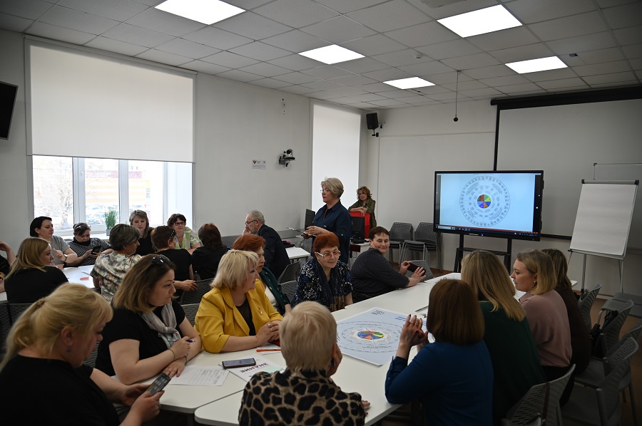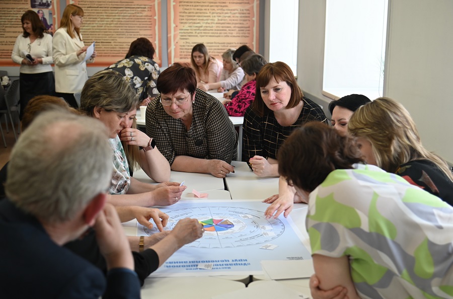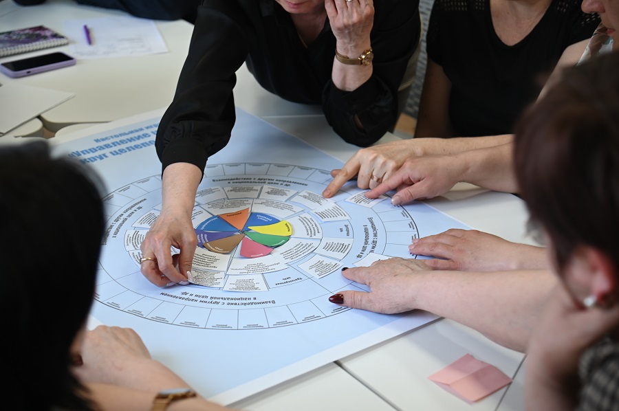 В ходе очной части курсов рассмотрен вопрос целеполагания в деятельности управленческих команд общеобразовательных организаций, проведен анализ ключевых подходов к построению системы целей и рисков в их реализации. В качестве инструмента для целеполагания и осуществления стратегического планирования слушателям предложена настольная игра «Управление школой: круг целеполагания», разработанная на основе концепции проекта «Школа Минпросвещения России» Институтом реализации государственной политики и профессионального развития работников образования Государственного университета просвещения. В ходе игры команды анализировали содержание и целевые ориентиры каждого магистрального направления проекта, соотносили их с текущим состоянием своей школы, а затем обосновывали пул проблем, которые могут быть решены за счет внедрения управленческих решений, в том числе непрерывного профессионального развития управленческих кадров.
